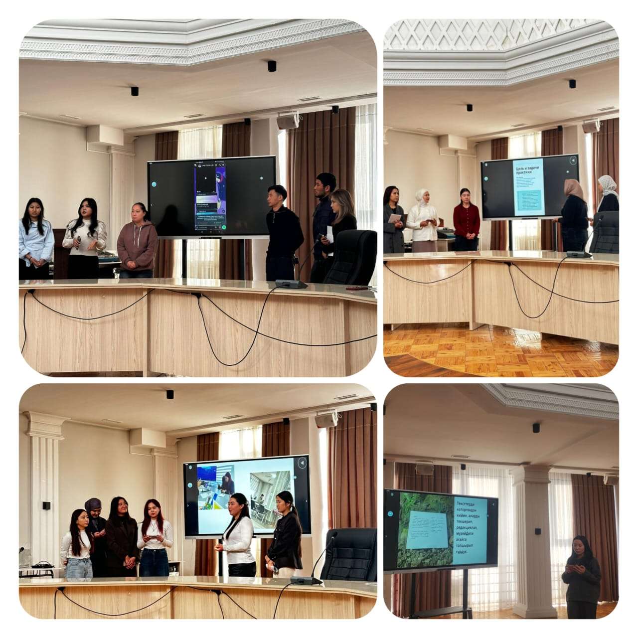 Ыдырысова С. провела ознакомительную проверку и беседу со студентами. В ходе практики студенты выполняют перевод текстов, осваивают работу с различными видами словарей, подбирают адекватные переводческие эквиваленты, а также изучают основы профессиональной переводческой деятельности. Кроме того, они знакомятся с музейной терминологией, развивают навыки письменного перевода и совершенствуют языковую компетенцию в условиях реальной профессиональной среды.